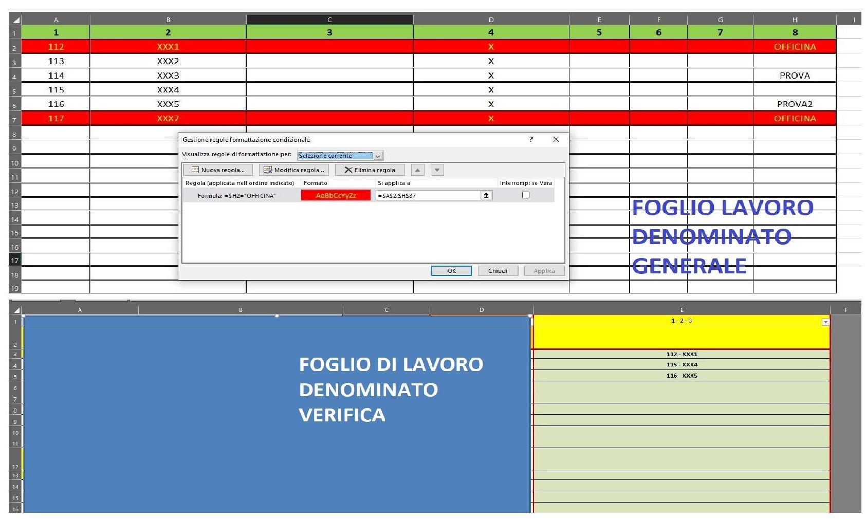 Esempio: il valore “112 – XXX1”, presente nel foglio denominato VERIFICA, è anche presente nel foglio denominato GENERALE, e qui, esso ha fondo rosso e font giallo, e dovrà prendere gli stessi colori di cella e font nel foglio denominato VERIFICA.